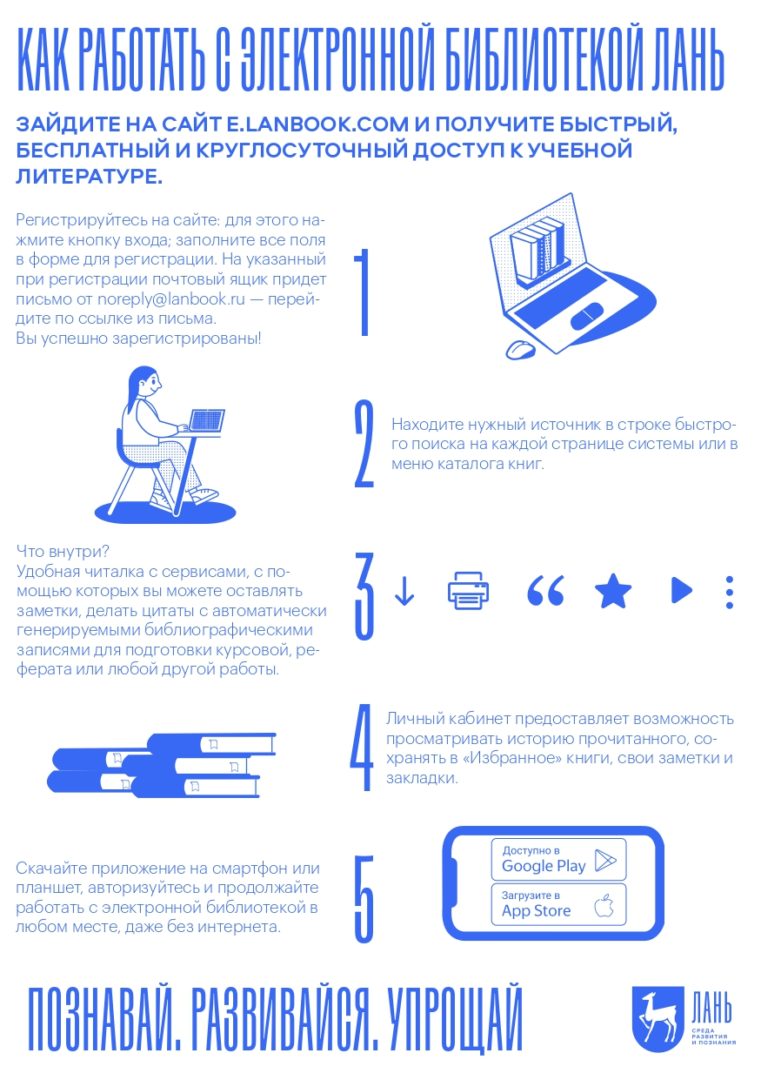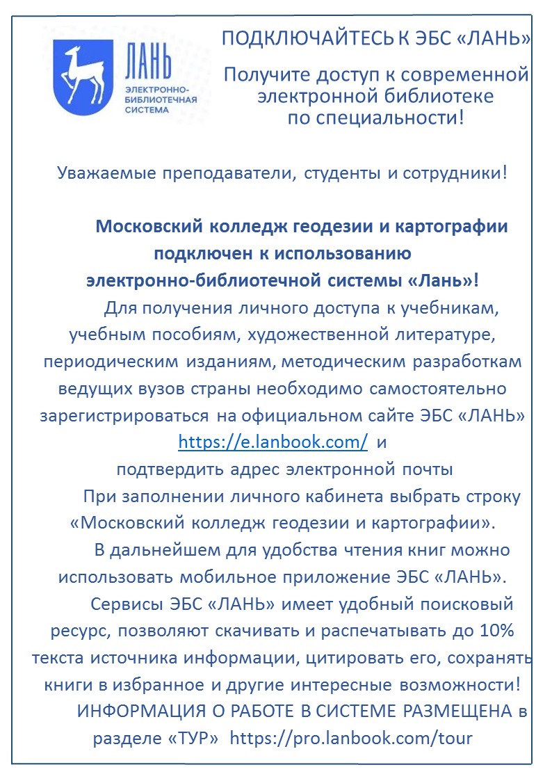 Электронно-библиотечная система "Лань" | Электронно-библиотечная система «Лань» - электронная библиотека лицензионной учебной и профессиональной литературы, предоставляющая доступ к учебникам, пособиям, монографиям, научным журналам на сайте ЭБС и в мобильных приложениях для iOS и Android. Студенты и преподаватели имеют доступ в электронный каталог всех книг ЭБС: учебникам, учебным пособиям, монографиям, книгам художественной литературы, периодическим изданиям, методическим разработкам преподавателей ведущих вузов страны. Инструкция 1 стр. Инструкция 2 стр. |